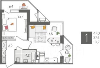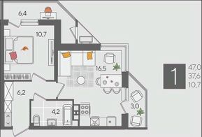 В продаже 1-комнатная квартира от застройщика! ЖК "Рекорд", г. Краснодар, Литер 1, общей площадью 47 кв.м., на 6 этаже.
