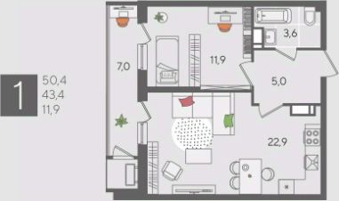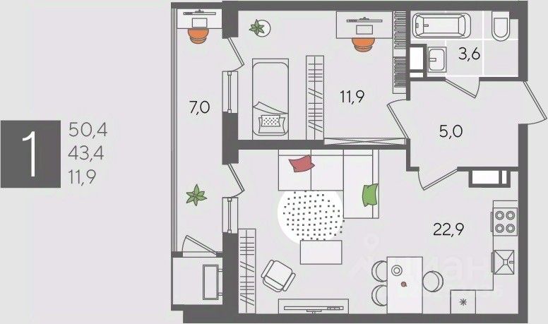 В продаже 1-комнатная квартира от застройщика! ЖК "Рекорд", г. Краснодар, Литер 1, общей площадью 50.4 кв.м., на 24 этаже.