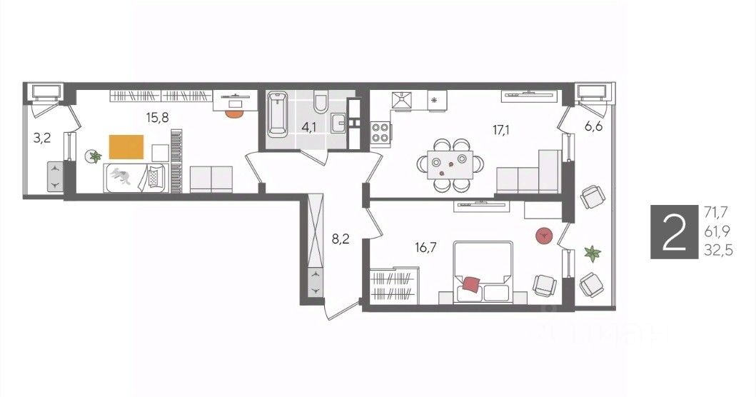 В продаже 2-комнатная квартира от застройщика! ЖК "Рекорд", г. Краснодар, Литер 1, общей площадью 71.7 кв.м., на 24 этаже.