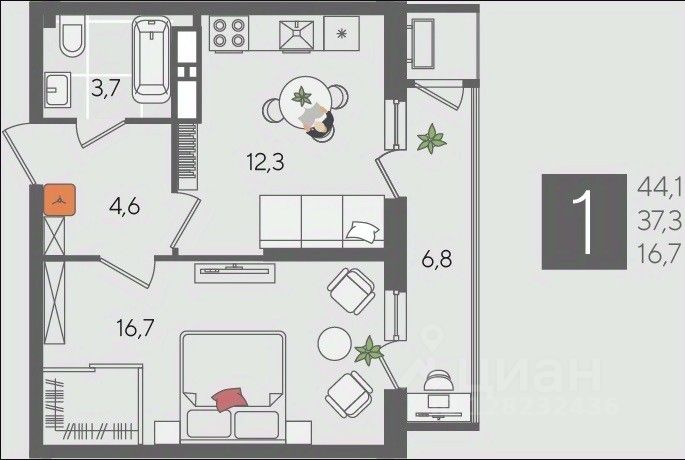 В продаже 1-комнатная квартира от застройщика! ЖК "Рекорд", г. Краснодар, Литер 1, общей площадью 44.1 кв.м., на 24 этаже.