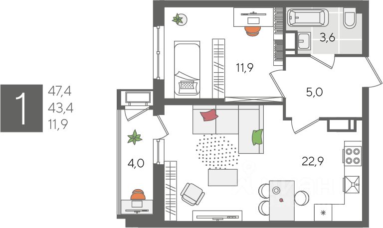 В продаже 1-комнатная квартира от застройщика! ЖК "Рекорд", г. Краснодар, Литер 1, общей площадью 47.4 кв.м., на 19 этаже.