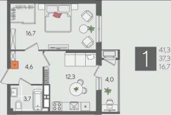В продаже 1-комнатная квартира от застройщика! ЖК "Рекорд", г. Краснодар, Литер 1, общей площадью 41.3 кв.м., на 15 этаже.