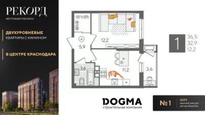 В продаже 1-комнатная квартира от застройщика! ЖК "Рекорд", г. Краснодар, Литер 1, общей площадью 36.5 кв.м., на 3 этаже.