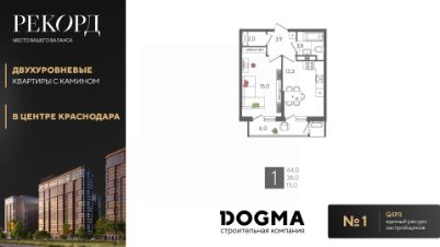 В продаже 1-комнатная квартира от застройщика! ЖК "Рекорд", г. Краснодар, Литер 1, общей площадью 44 кв.м., на 24 этаже.