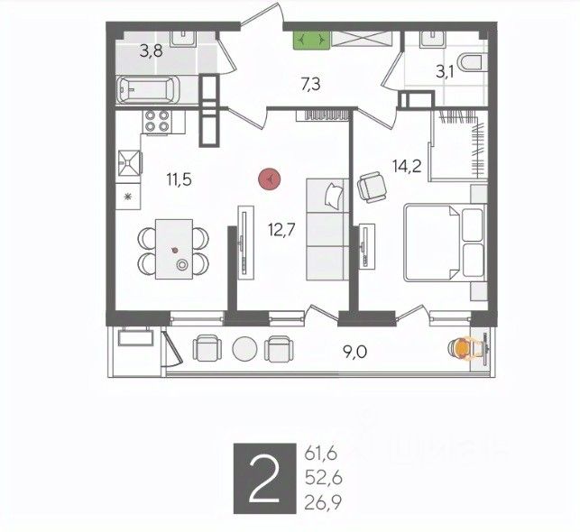 В продаже 2-комнатная квартира от застройщика! ЖК "Рекорд", г. Краснодар, Литер 1, общей площадью 61.6 кв.м., на 24 этаже.