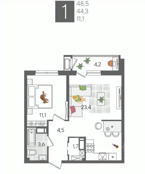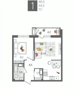 В продаже 1-комнатная квартира от застройщика! ЖК "Рекорд", г. Краснодар, Литер 1, общей площадью 48.5 кв.м., на 17 этаже.
