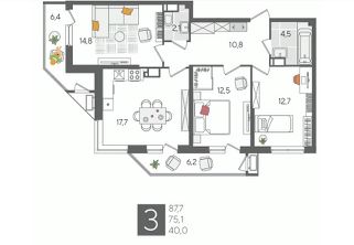 В продаже 3-комнатная квартира от застройщика! ЖК "Рекорд", г. Краснодар, Литер 1, общей площадью 87.7 кв.м., на 15 этаже.