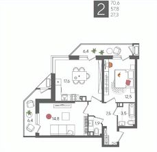 В продаже 2-комнатная квартира от застройщика! ЖК "Рекорд", г. Краснодар, Литер 1, общей площадью 70.6 кв.м., на 6 этаже.