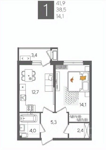В продаже 1-комнатная квартира от застройщика! ЖК "Рекорд", г. Краснодар, Литер 1, общей площадью 41.9 кв.м., на 2 этаже.