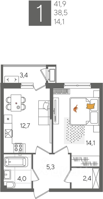 В продаже 1-комнатная квартира от застройщика! ЖК "Рекорд", г. Краснодар, Литер 1, общей площадью 41.9 кв.м., на 2 этаже.