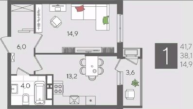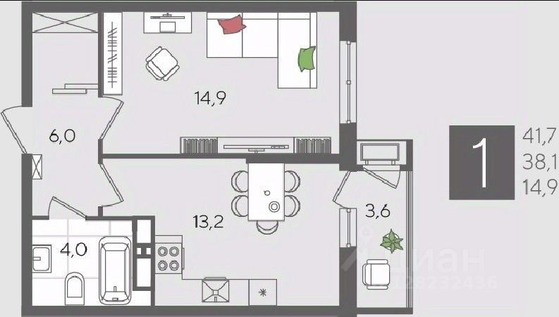 В продаже 1-комнатная квартира от застройщика! ЖК "Рекорд", г. Краснодар, Литер 3, общей площадью 41.7 кв.м., на 14 этаже.