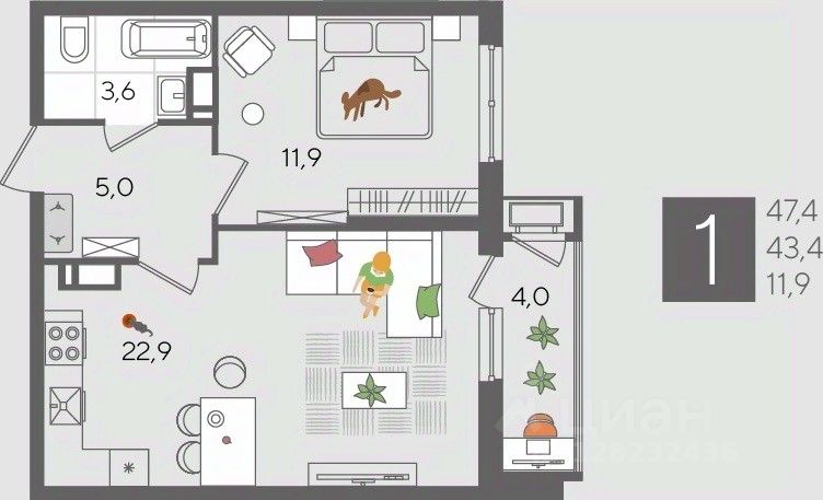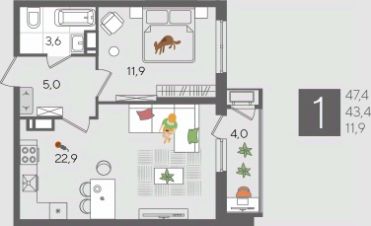 В продаже 1-комнатная квартира от застройщика! ЖК "Рекорд", г. Краснодар, Литер 3, общей площадью 47.4 кв.м., на 12 этаже.