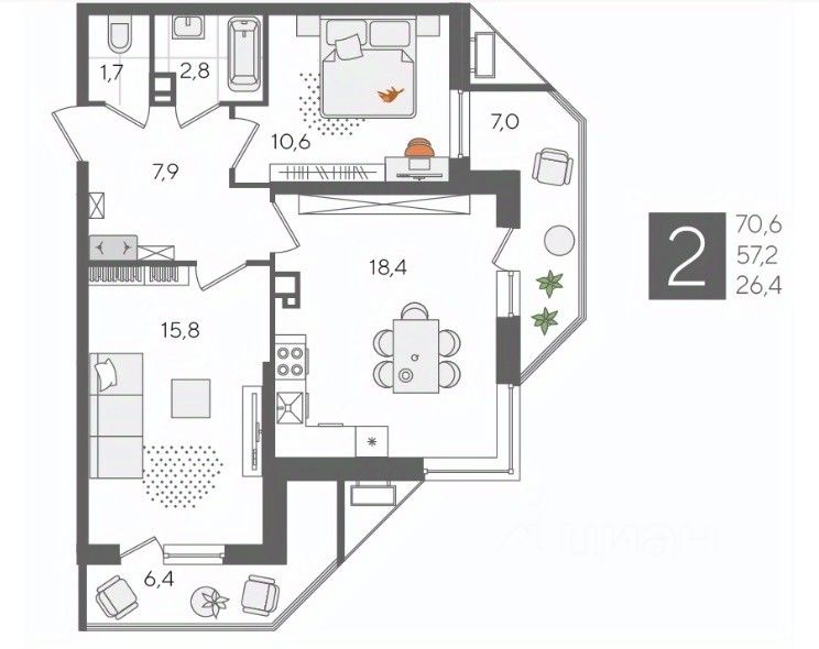 В продаже 2-комнатная квартира от застройщика! ЖК "Рекорд", г. Краснодар, Литер 3, общей площадью 70.6 кв.м., на 10 этаже.