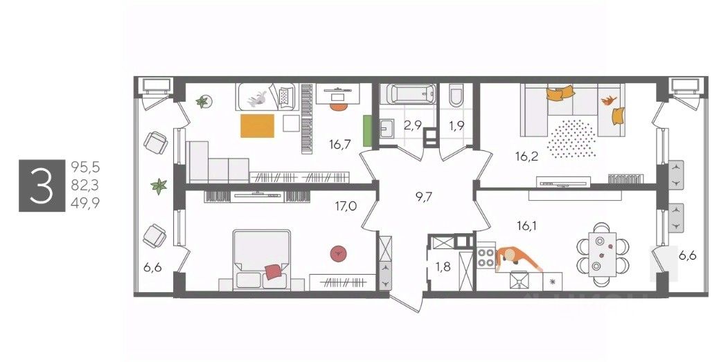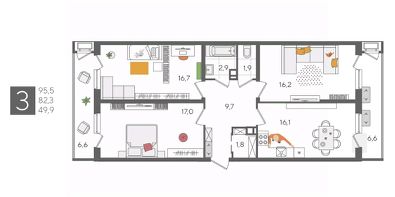 В продаже 3-комнатная квартира от застройщика! ЖК "Рекорд", г. Краснодар, Литер 3, общей площадью 95.5 кв.м., на 3 этаже.