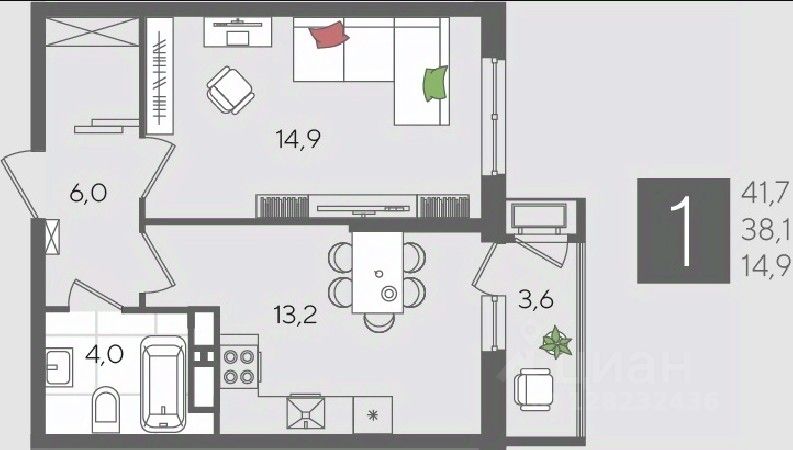 В продаже 1-комнатная квартира от застройщика! ЖК "Рекорд", г. Краснодар, Литер 3, общей площадью 41.7 кв.м., на 13 этаже.