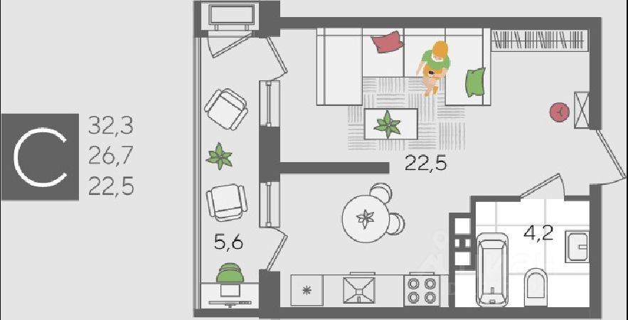 В продаже студия от застройщика! ЖК "Рекорд", г. Краснодар, Литер 3, общей площадью 32.3 кв.м., на 6 этаже.