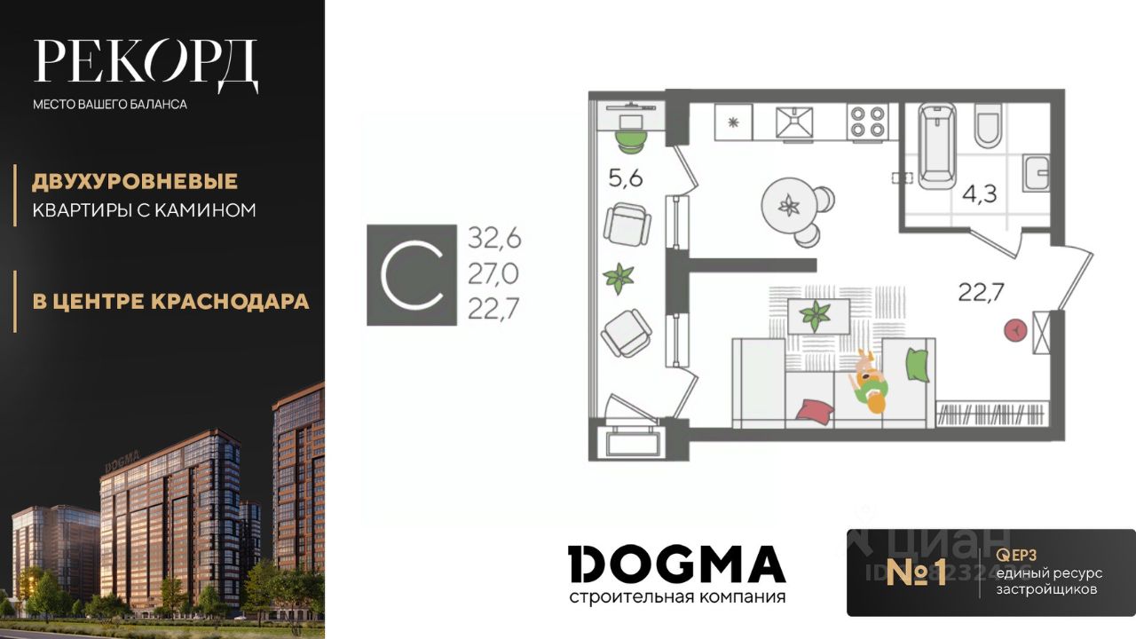 В продаже студия от застройщика! ЖК "Рекорд", г. Краснодар, Литер 3, общей площадью 32.6 кв.м., на 2 этаже.