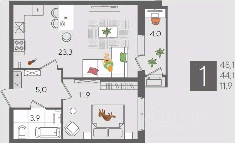 В продаже 1-комнатная квартира от застройщика! ЖК "Рекорд", г. Краснодар, Литер 3, общей площадью 48.1 кв.м., на 2 этаже.