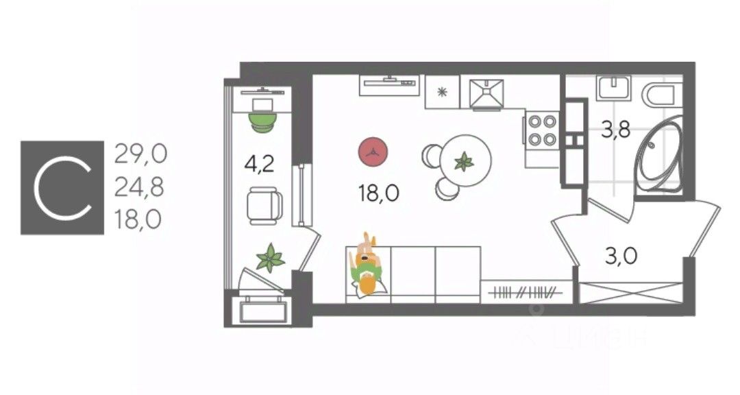 В продаже студия от застройщика! ЖК "Рекорд", г. Краснодар, Литер 6, общей площадью 29 кв.м., на 17 этаже.