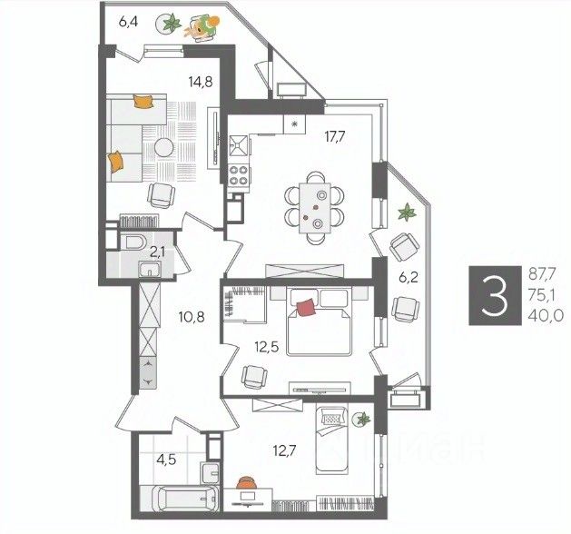 В продаже 3-комнатная квартира от застройщика! ЖК "Рекорд", г. Краснодар, Литер 6, общей площадью 87.7 кв.м., на 15 этаже.
