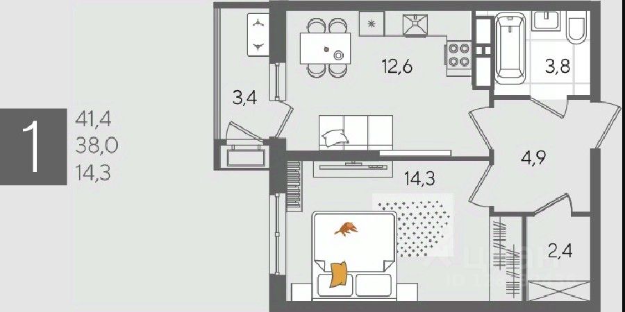 В продаже 1-комнатная квартира от застройщика! ЖК "Рекорд", г. Краснодар, Литер 6, общей площадью 41.4 кв.м., на 14 этаже.