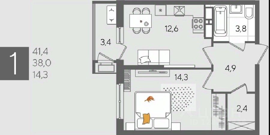 В продаже 1-комнатная квартира от застройщика! ЖК "Рекорд", г. Краснодар, Литер 6, общей площадью 41.4 кв.м., на 12 этаже.