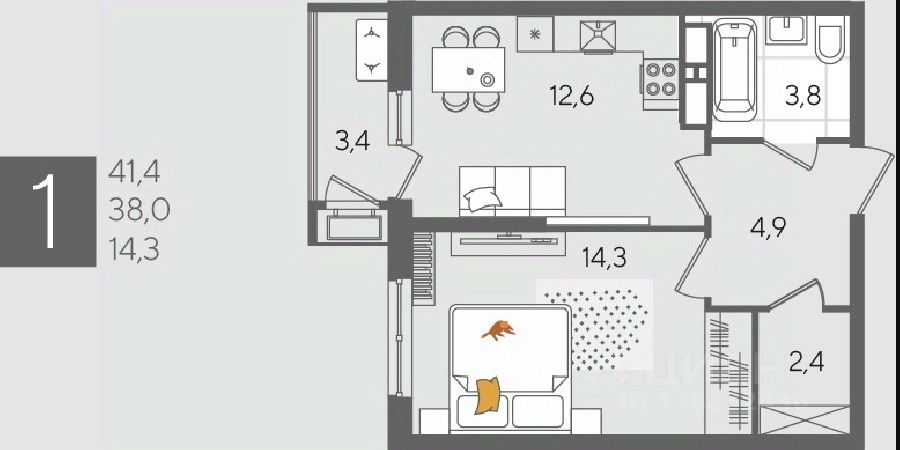 В продаже 1-комнатная квартира от застройщика! ЖК "Рекорд", г. Краснодар, Литер 6, общей площадью 41.4 кв.м., на 11 этаже.