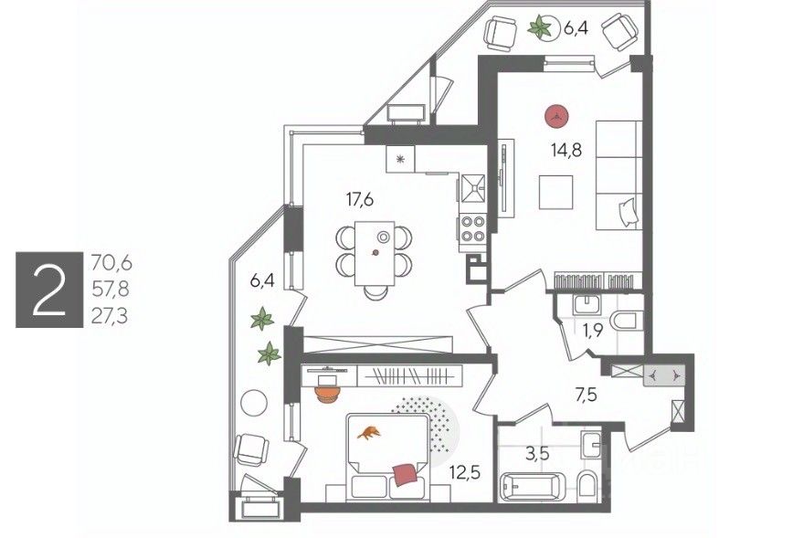 В продаже 2-комнатная квартира от застройщика! ЖК "Рекорд", г. Краснодар, Литер 6, общей площадью 70.6 кв.м., на 9 этаже.