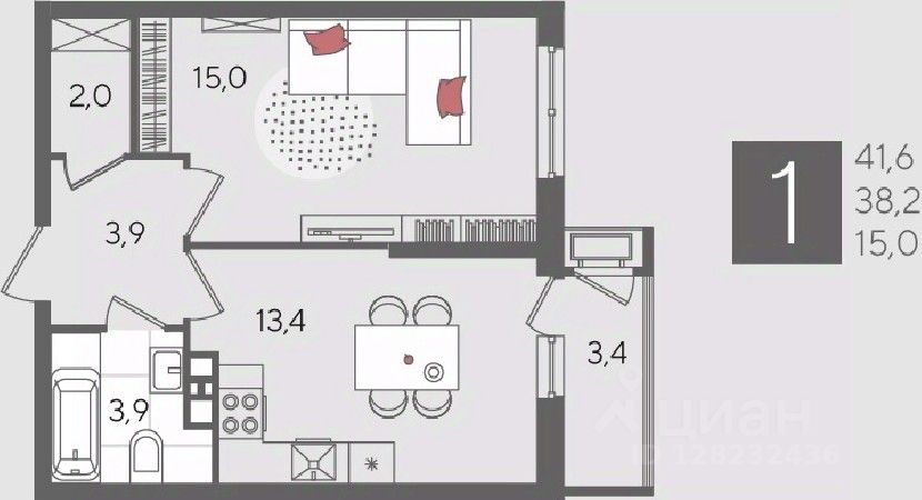 В продаже 1-комнатная квартира от застройщика! ЖК "Рекорд", г. Краснодар, Литер 6, общей площадью 41.6 кв.м., на 8 этаже.