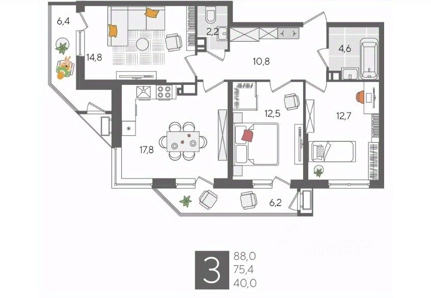 В продаже 3-комнатная квартира от застройщика! ЖК "Рекорд", г. Краснодар, Литер 6, общей площадью 88 кв.м., на 3 этаже.