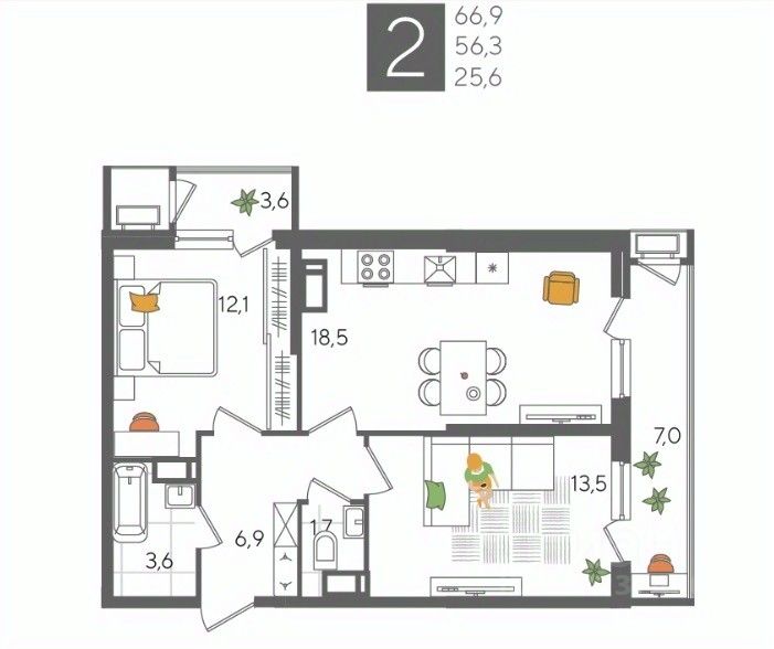 В продаже 2-комнатная квартира от застройщика! ЖК "Рекорд", г. Краснодар, Литер 6, общей площадью 66.9 кв.м., на 24 этаже.