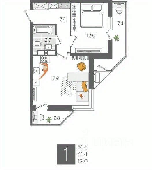В продаже 1-комнатная квартира от застройщика! ЖК "Рекорд", г. Краснодар, Литер 6, общей площадью 51.6 кв.м., на 24 этаже.