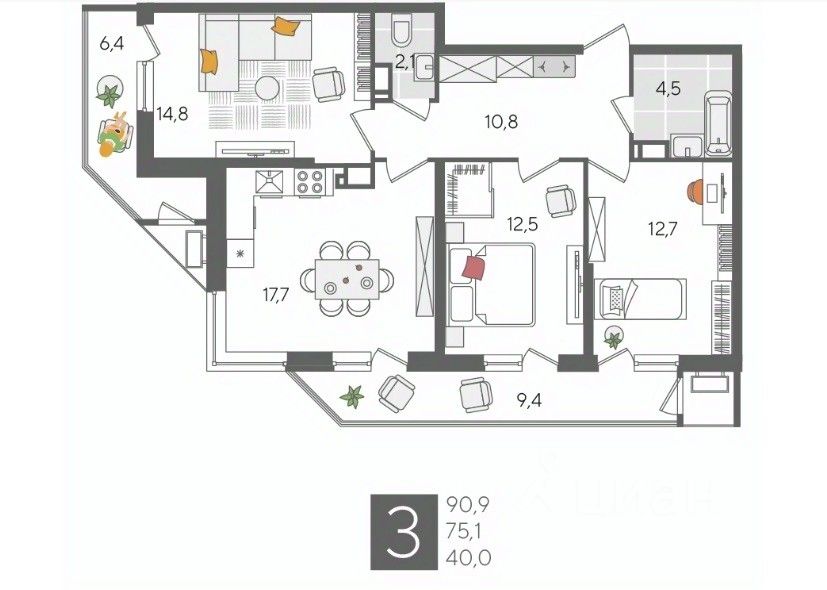В продаже 3-комнатная квартира от застройщика! ЖК "Рекорд", г. Краснодар, Литер 6, общей площадью 90.9 кв.м., на 24 этаже.