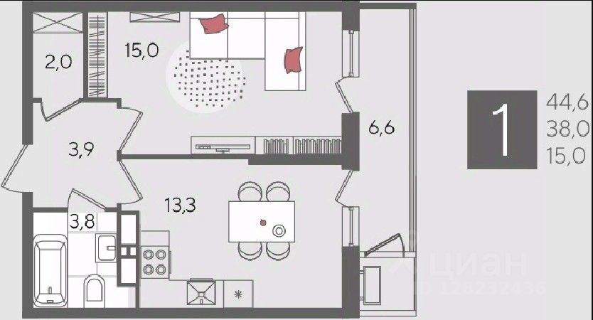 В продаже 1-комнатная квартира от застройщика! ЖК "Рекорд", г. Краснодар, Литер 6, общей площадью 44.6 кв.м., на 22 этаже.