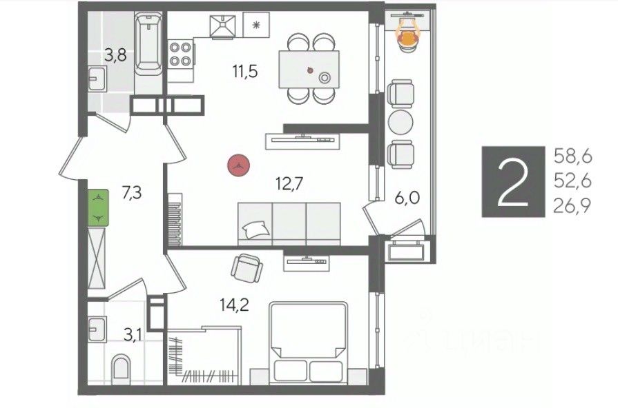 В продаже 2-комнатная квартира от застройщика! ЖК "Рекорд", г. Краснодар, Литер 6, общей площадью 58.6 кв.м., на 20 этаже.