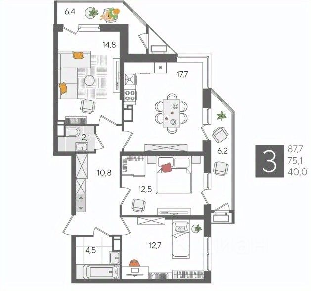 В продаже 3-комнатная квартира от застройщика! ЖК "Рекорд", г. Краснодар, Литер 6, общей площадью 87.7 кв.м., на 14 этаже.