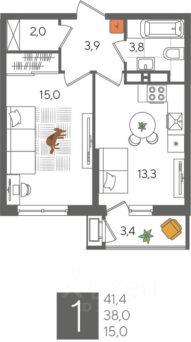 В продаже 1-комнатная квартира от застройщика! ЖК "Рекорд", г. Краснодар, Литер 6, общей площадью 41.4 кв.м., на 12 этаже.