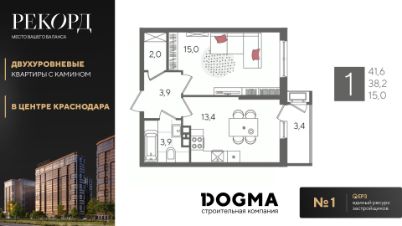 В продаже 1-комнатная квартира от застройщика! ЖК "Рекорд", г. Краснодар, Литер 6, общей площадью 41.6 кв.м., на 10 этаже.