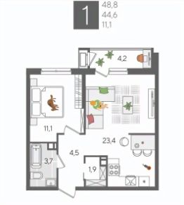 В продаже 1-комнатная квартира от застройщика! ЖК "Рекорд", г. Краснодар, Литер 6, общей площадью 48.8 кв.м., на 7 этаже.
