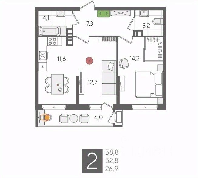 В продаже 2-комнатная квартира от застройщика! ЖК "Рекорд", г. Краснодар, Литер 6, общей площадью 58.8 кв.м., на 6 этаже.
