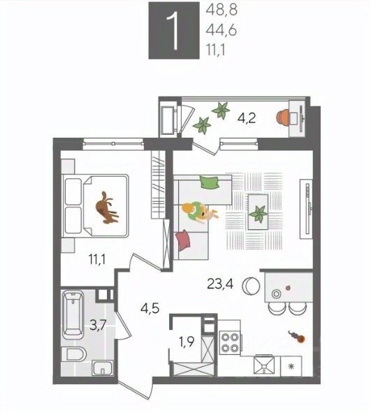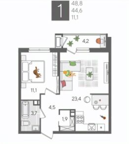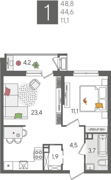 В продаже 1-комнатная квартира от застройщика! ЖК "Рекорд", г. Краснодар, Литер 6, общей площадью 48.8 кв.м., на 5 этаже.