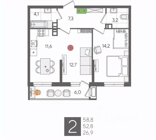 В продаже 2-комнатная квартира от застройщика! ЖК "Рекорд", г. Краснодар, Литер 6, общей площадью 58.8 кв.м., на 5 этаже.