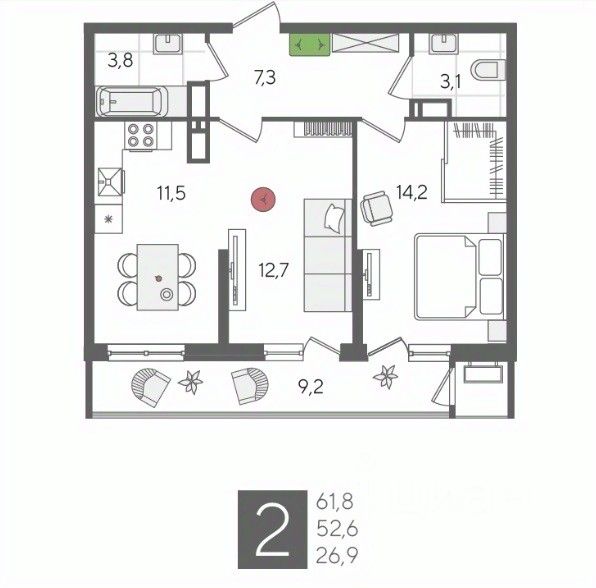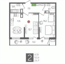 В продаже 2-комнатная квартира от застройщика! ЖК "Рекорд", г. Краснодар, Литер 6, общей площадью 61.8 кв.м., на 23 этаже.