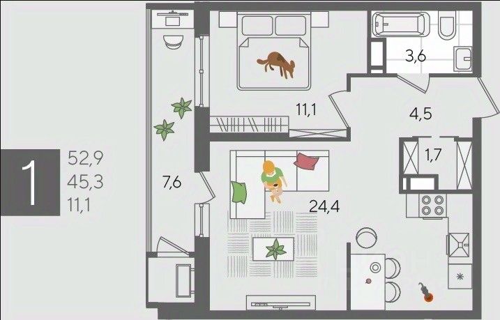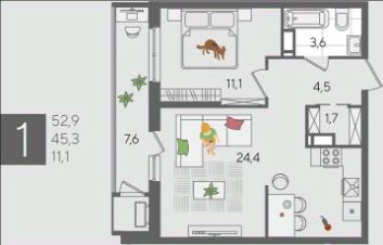 В продаже 1-комнатная квартира от застройщика! ЖК "Рекорд", г. Краснодар, Литер 4, общей площадью 52.9 кв.м., на 24 этаже.