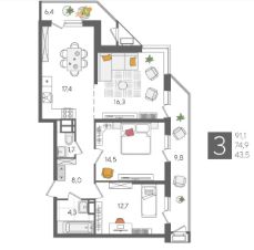 В продаже 3-комнатная квартира от застройщика! ЖК "Рекорд", г. Краснодар, Литер 4, общей площадью 91.1 кв.м., на 21 этаже.