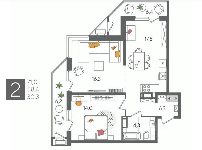 В продаже 2-комнатная квартира от застройщика! ЖК "Рекорд", г. Краснодар, Литер 4, общей площадью 71 кв.м., на 19 этаже.