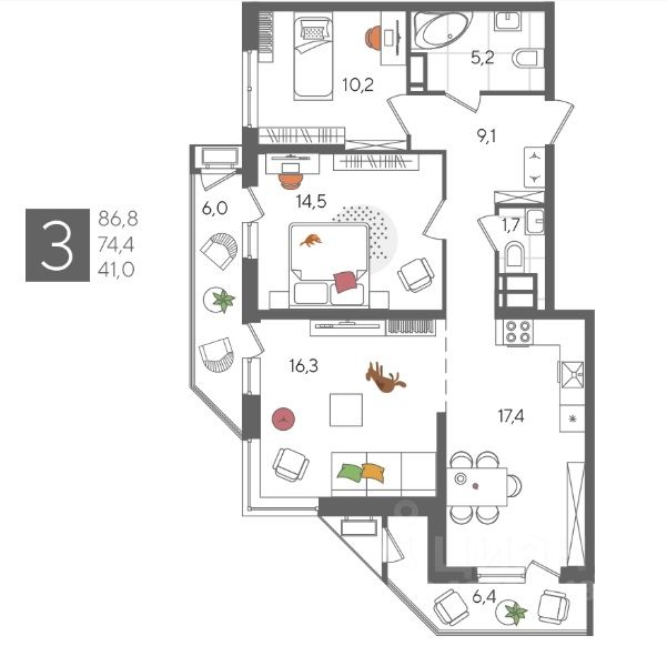 В продаже 3-комнатная квартира от застройщика! ЖК "Рекорд", г. Краснодар, Литер 4, общей площадью 86.8 кв.м., на 14 этаже.