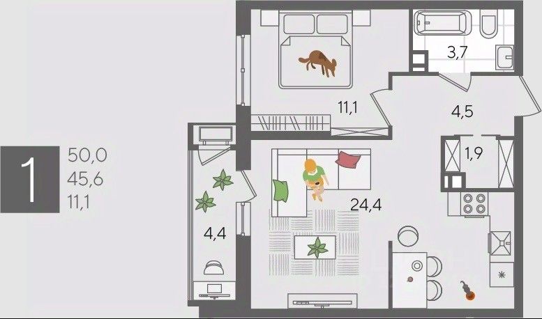 В продаже 1-комнатная квартира от застройщика! ЖК "Рекорд", г. Краснодар, Литер 4, общей площадью 50 кв.м., на 9 этаже.