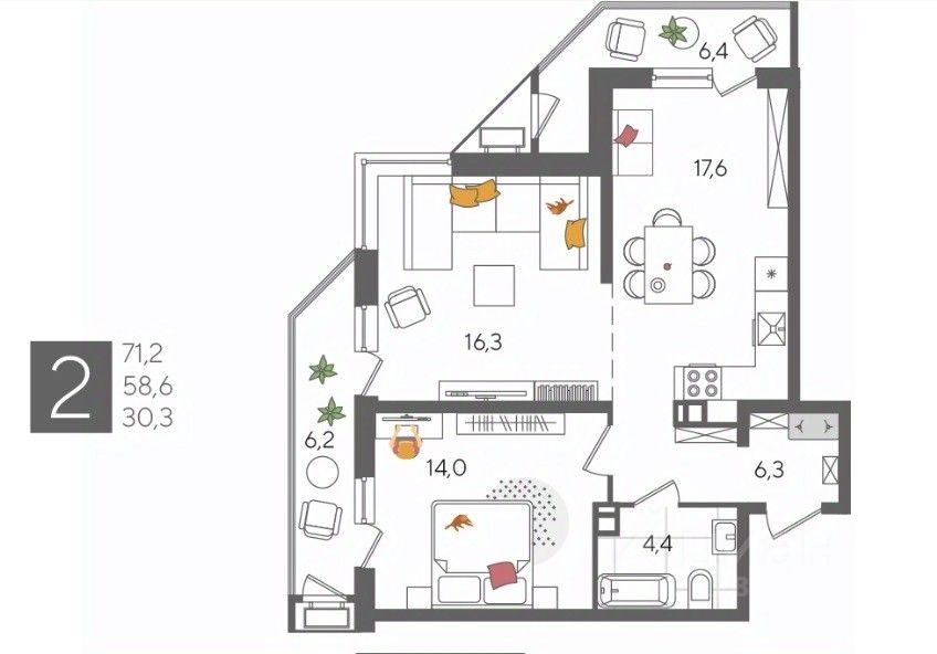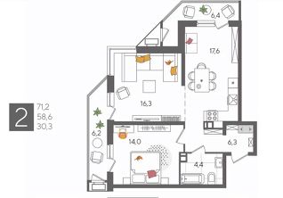 В продаже 2-комнатная квартира от застройщика! ЖК "Рекорд", г. Краснодар, Литер 4, общей площадью 71.2 кв.м., на 6 этаже.
