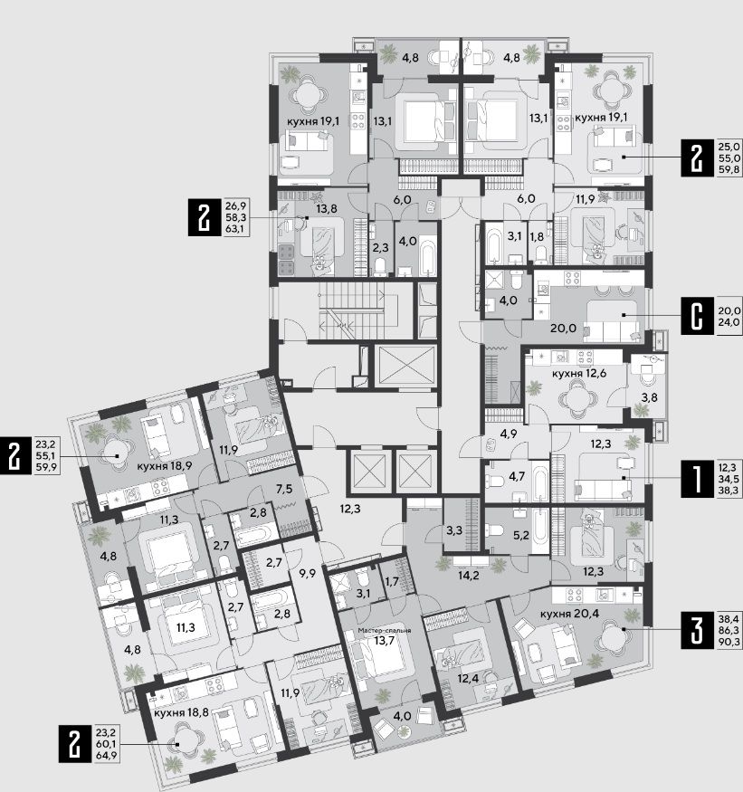•Квартиры с мастер-спальнями и отдельными гардеробными